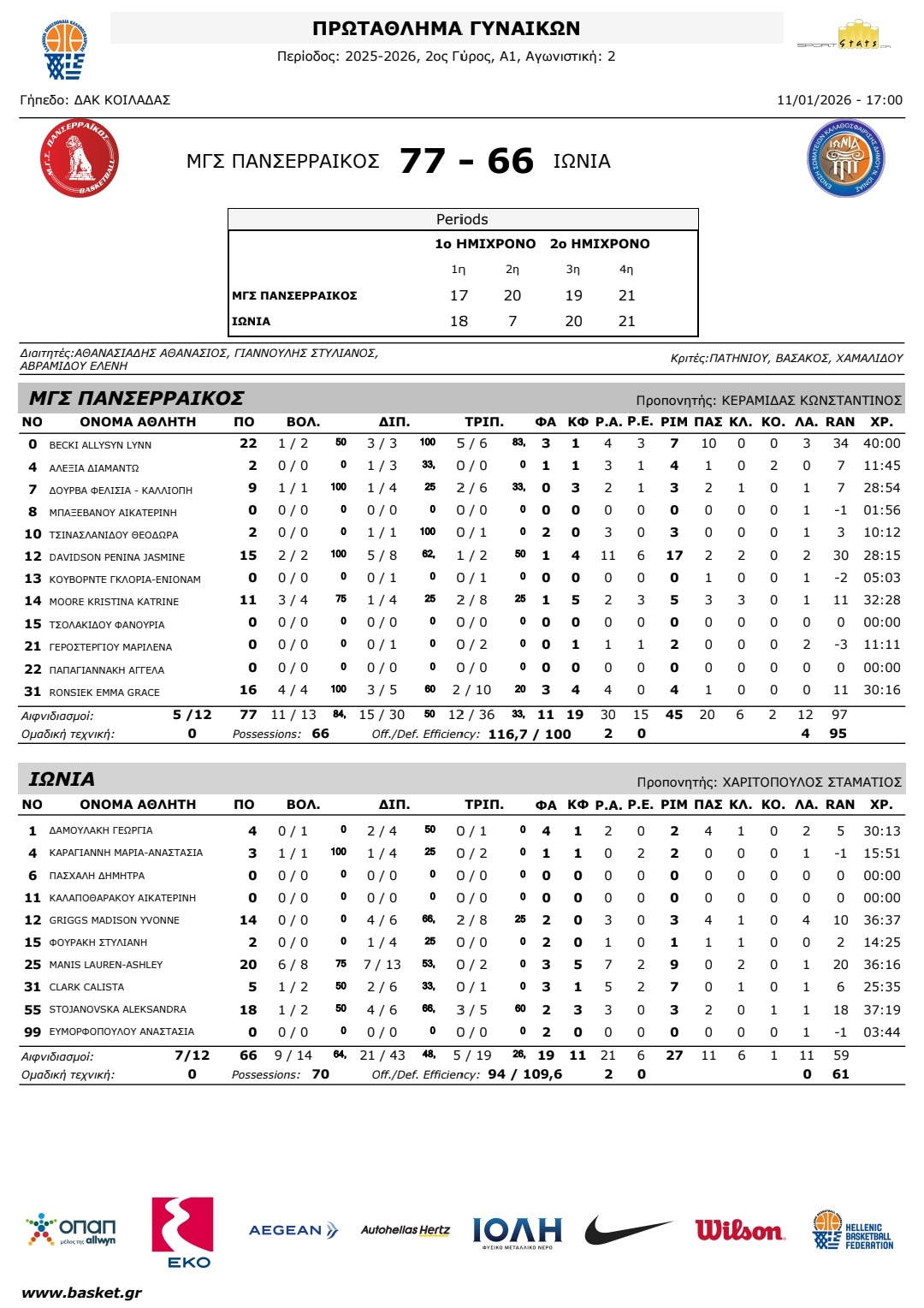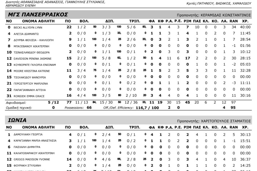 Πανσερραϊκός (Κεραμιδάς): Μπέκι 22(5), Αλεξιά 2, Δούρβα 9(2), Μπαξεβάνου, Τσινασλανίδου 2, Ντάβινσον 15(1), Κουβόρντε, Μουρ 11(2), Γεροστεργίου, Ρόνσιεκ 16(2).